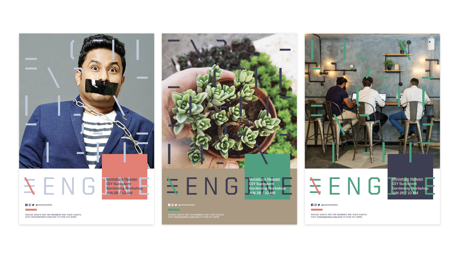 Concept identity directions for a new co-working space. These visual explorations came after an extensive brand-building and positioning exercise, where we imagined a fresh, young and confident community.